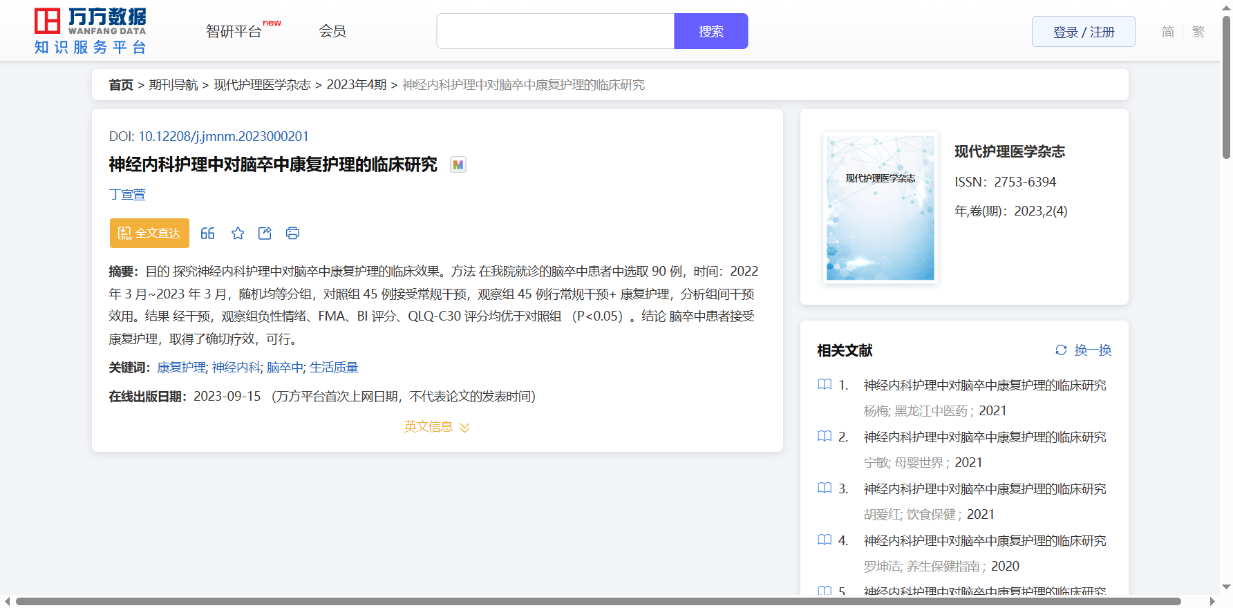 [2] 盛井香,郭琳,马莉,等. 网络平台下的康复护理指导对脑卒中偏瘫患者肢体功能康复的影响[J]. 齐鲁护理杂志,2023,29(1):79-83.