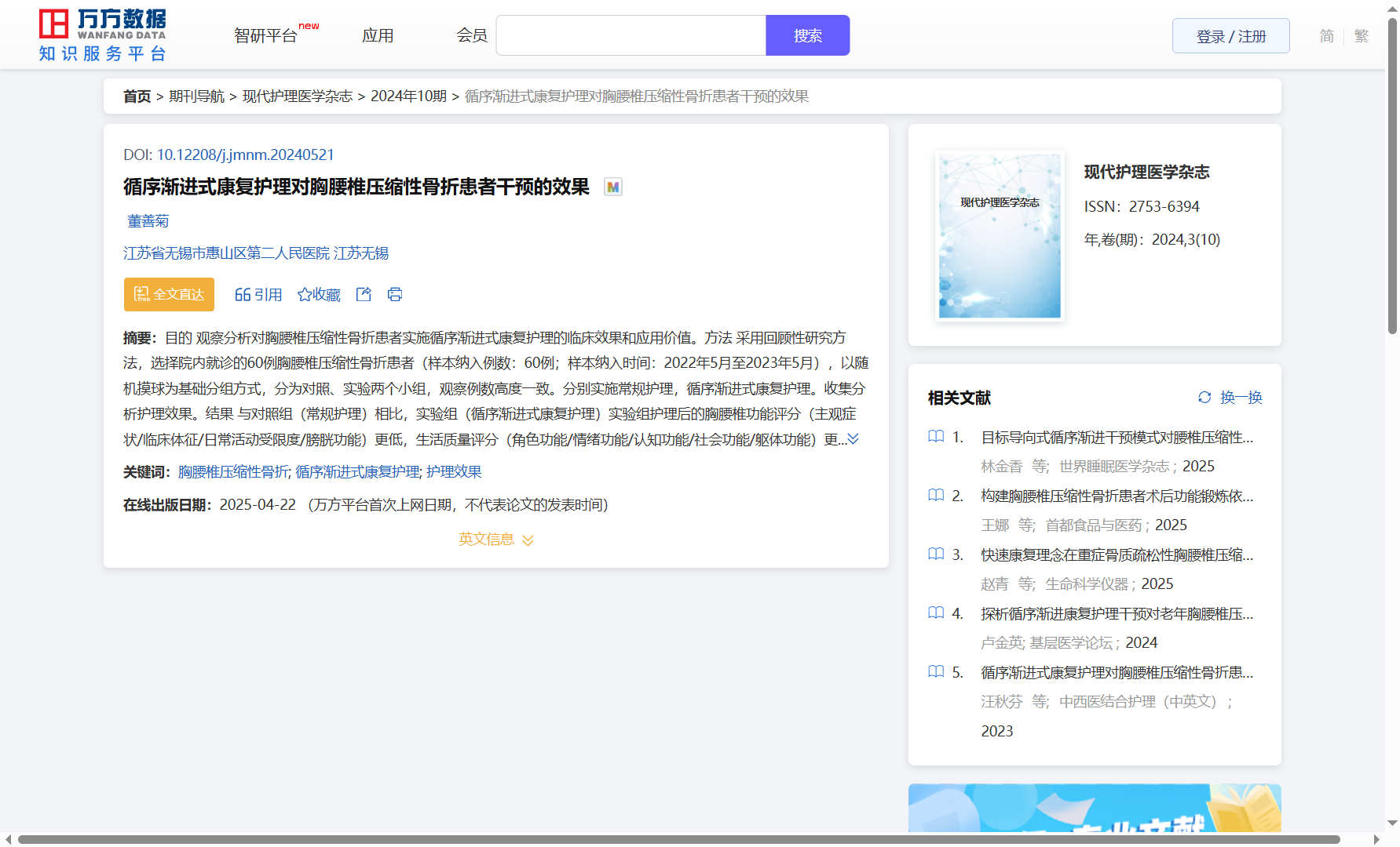 目的 观察分析对胸腰椎压缩性骨折患者实施循序渐进式康复护理的临床效果和应用价值。方法 采用回顾性研究方法,选择院内就诊的60例胸腰椎压缩性骨折患者(样本纳入例数:60例;样本纳入时间:2022年5月至2023年5月)..