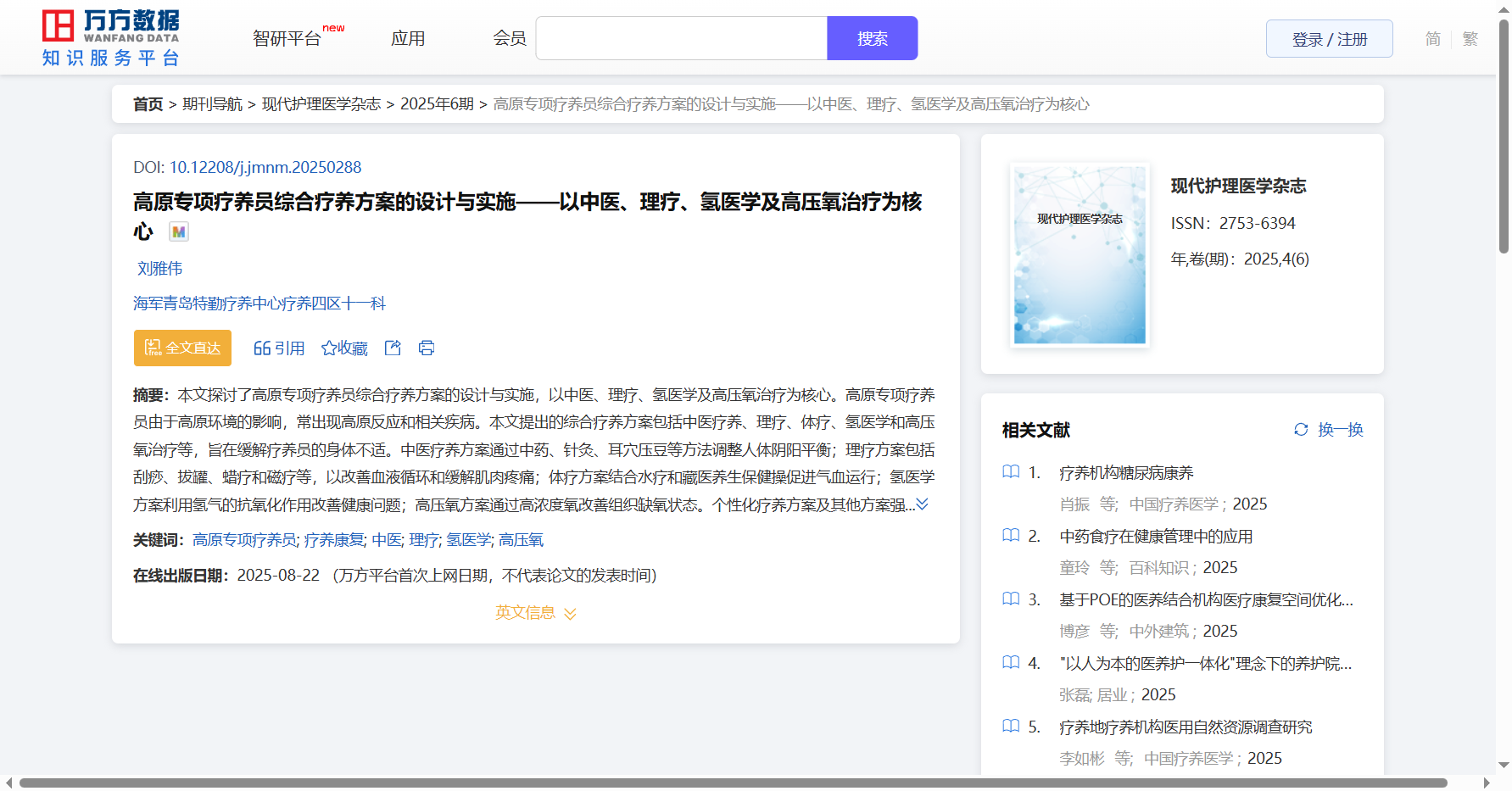 本文探讨了高原专项疗养员综合疗养方案的设计与实施,以中医、理疗、氢医学及高压氧治疗为核心。高原专项疗养员由于高原环境的影响,常出现高原反应和相关疾病。本文提出的综合疗养方案包括中医疗养、理疗、体疗、氢..