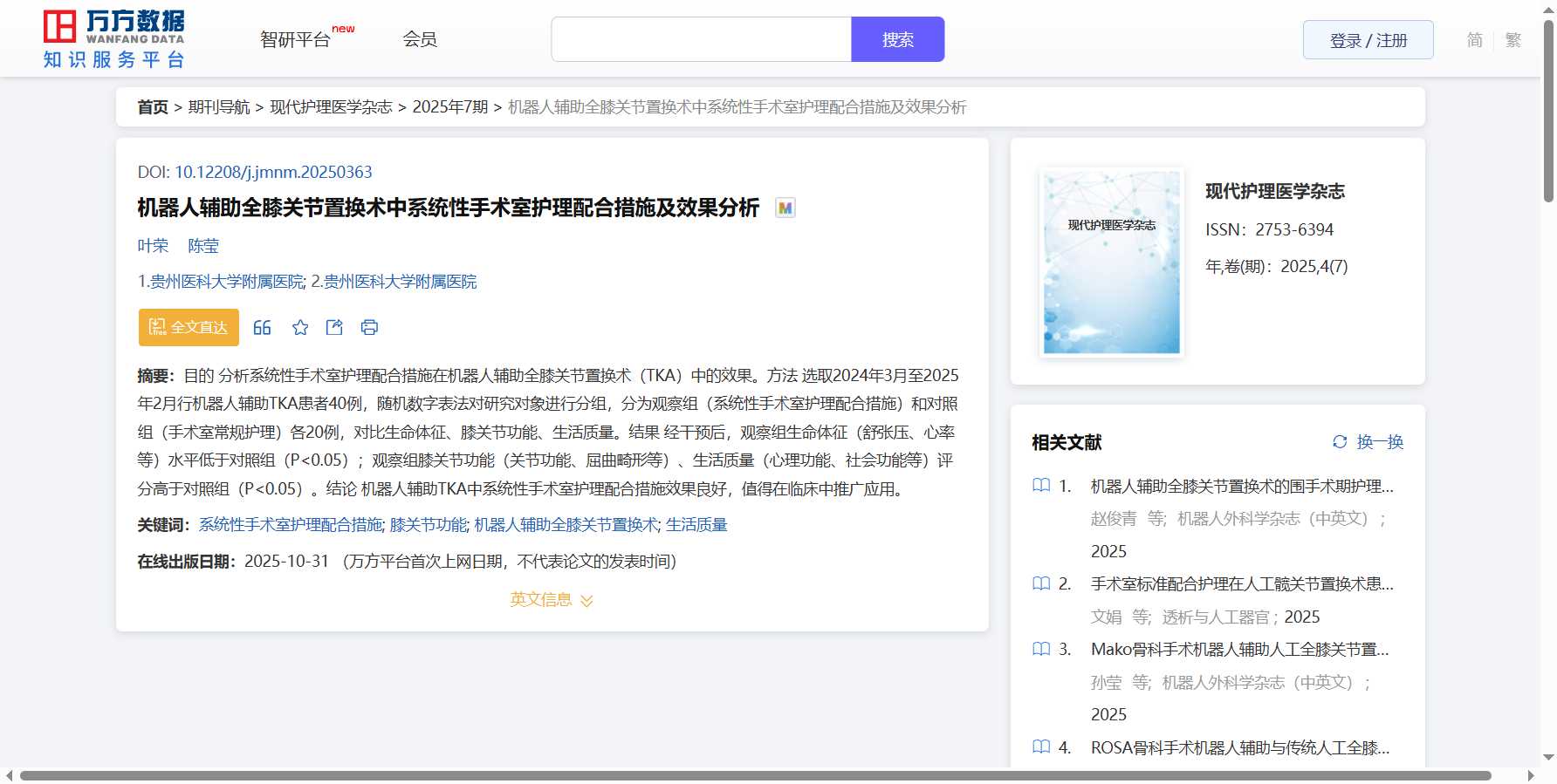 目的 分析系统性手术室护理配合措施在机器人辅助全膝关节置换术(TKA)中的效果。方法 选取2024年3月至2025年2月行机器人辅助TKA患者40例,随机数字表法对研究对象进行分组,分为观察组(系统性手术室护理配合措施)..